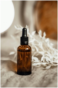 Elegant amber glass dropper bottle with organic oil and white botanicals on a cozy linen background.