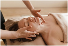 Woman receiving a soothing facial massage, promoting relaxation and wellness.