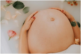 Pregnant woman relaxing in a soothing milk bath with flowers, embracing maternity.