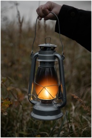 A vintage lantern glowing with warm light, held in