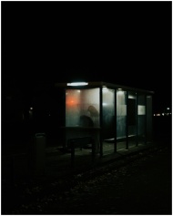 A solitary figure waits at a dimly lit bus stop in