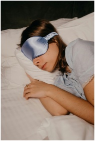 A woman peacefully sleeping with a satin eye mask, providing a sense of relaxation and comfort.