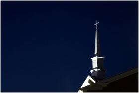Illuminated church steeple with cross at night. Perfect for religious and architectural themes.