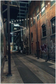 Cozy urban alley illuminated by string lights, sho