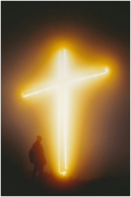 Silhouette of a man by a glowing cross at night in a misty outdoor setting.