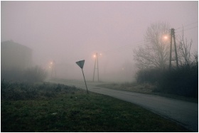Moody fog envelops a rural street at night, illuminated by street lamps.