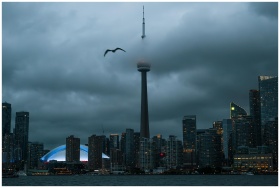 Toronto skyline featuring CN Tower shrouded in clo
