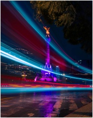 Long exposure night shot of Mexico City's Angel of Independence with dynamic light trails on Reforma Avenue.