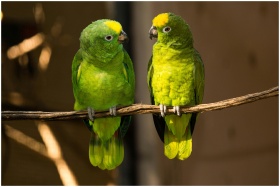 Two vibrant green parrots perched on a branch in their natural habitat. Perfect wildlife shot.