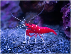 Close-up of a vibrant red shrimp on a pebbled unde