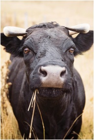 Detailed close-up of a black cow with horns in a grassy rural setting, emphasizing farm life.