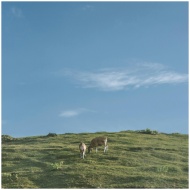 Peaceful landscape with two cows grazing on a grassy hill under a clear blue sky.