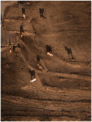 Aerial shot capturing horses grazing in a rural landscape, casting long shadows.