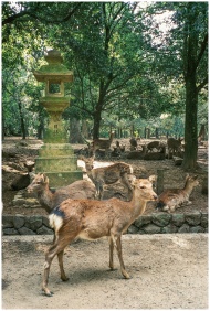Group of sika deer roaming freely in the serene setting of Nara Park, Japan.