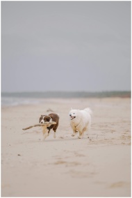 Two dogs, an Australian Shepherd and a Samoyed, running joyfully on a sandy beach.