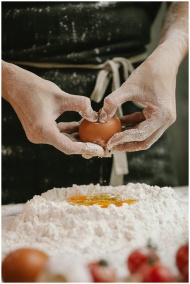 Hands in flour shape dough mound cracking an egg i