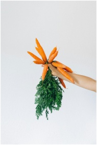 A hand holding a fresh bunch of organic carrots with vibrant green tops.