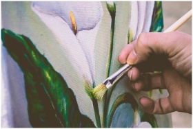 Close-up view of an artist painting a floral desig