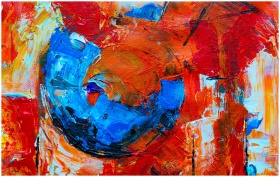 A vivid and colorful abstract painting featuring bold acrylic textures in red, blue, and orange hues.