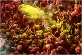 Crowd celebrating Holi festival with colorful powders in vibrant outdoor setting.