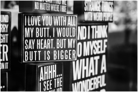 Monochrome arrangement of funny quotes and sayings displayed on a shelf.
