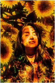 Artistic portrait of a woman illuminated by a sunflower projection, blending natural beauty and creativity.