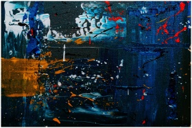 Colorful abstract painting featuring dynamic brushstrokes and vibrant splashes on canvas.