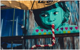 Colorful mural depicting a child with a pipe, showcasing vibrant street art in Dubai.