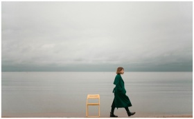 A solitary woman walks by the ocean, capturing calm and introspective solitude.