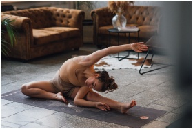 Woman practicing yoga indoors, showcasing flexibil