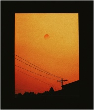 Silhouetted view of smoky orange sunset through window in Portland with power lines.