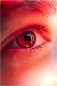 Macro shot of a human eye with a striking red hue, showcasing the pupil and iris.
