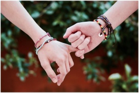Two hands with colorful bracelets interlocked, symbolizing friendship and connection.