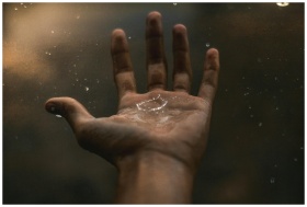 A close-up of an open hand catching raindrops against a dark background, showcasing water interaction.