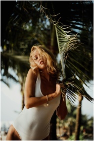 A blonde woman poses with palm leaves in Bali, exu