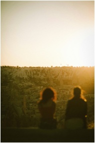 Silhouettes of two people overlooking Göreme's landscape at sunset, Turkey.
