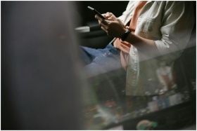 Casual man texting on smartphone while traveling as a passenger in a car.