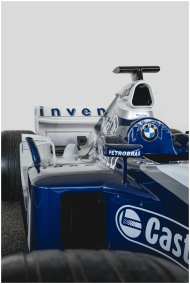 Detailed shot of a blue and white Formula 1 race car, highlighting its design and branding.