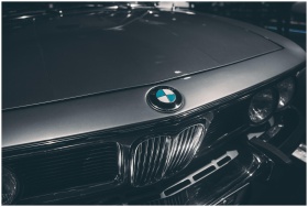Close-up of classic BMW hood showcasing emblem and chrome details. Captured in Munich, Germany.