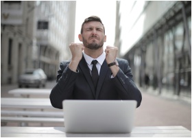 Confident businessman in Budapest celebrates success with a fist pump, reflecting a professional achievement.
