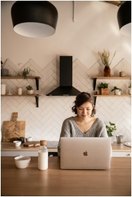 Young female student in gray sweater sitting at wooden desk with laptop and bottle of milk near white bowl during distance education at home