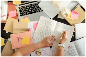 Overhead shot of a person organizing notes and study materials on a cluttered desk with a laptop.