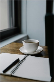 A cup of coffee and an open notebook by a window i
