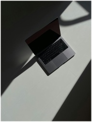 Artistic overhead view of an open laptop casting shadows on a flat surface.