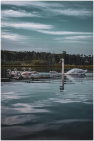 A graceful group of swans swims elegantly on a peaceful lake under a cloudy sky.