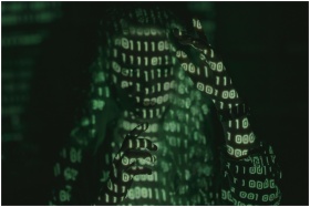 An unrecognizable person with binary code projected, symbolizing cybersecurity and digital coding.