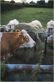 Cows feeding on hay in a rural outdoor pasture set