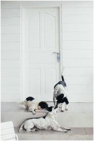 Three dogs playing on stairs in front of a white d
