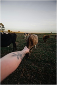 Person's tattooed arm reaching out to a cow in a serene countryside setting at dusk.