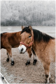 Two brown horses with red halters standing in a frosty winter field.